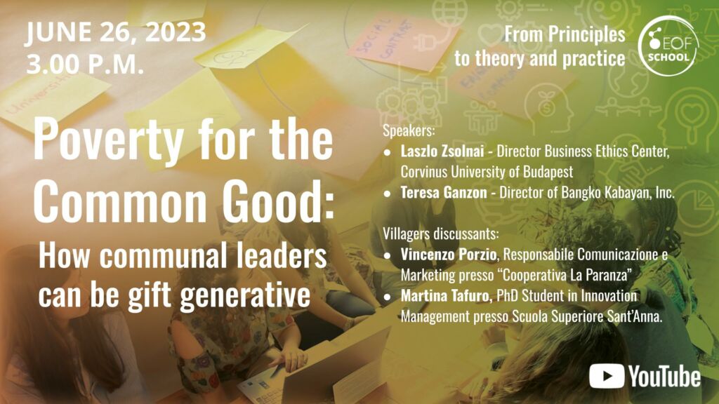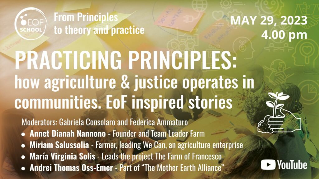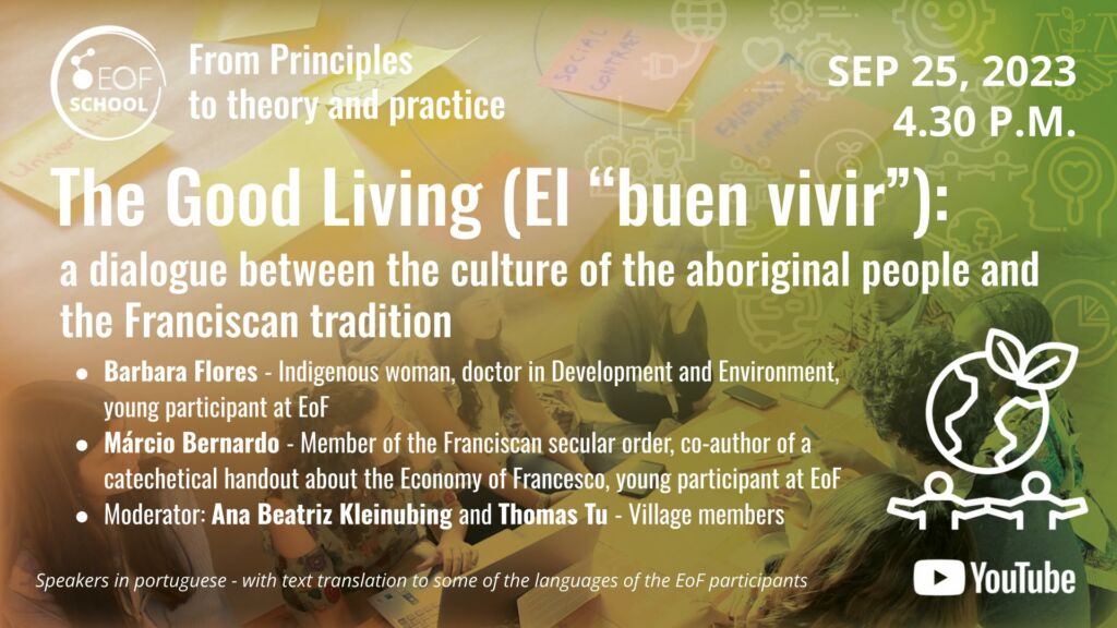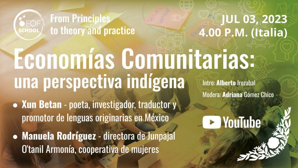 This year’s EoF School builds on the Final Statement that the thematic villages developed during the 2022 global event. Behind each principle there is theory, practice, work and commitment of the young people who make up the EoF community and that will give way to discuss and deepen the major issues of the global economy. Each of the principles that make up the Final Statement will be deepened by the members of the thematic villages in participatory lessons throughout the year: 12 lessons, one per month, last Monday of the month.