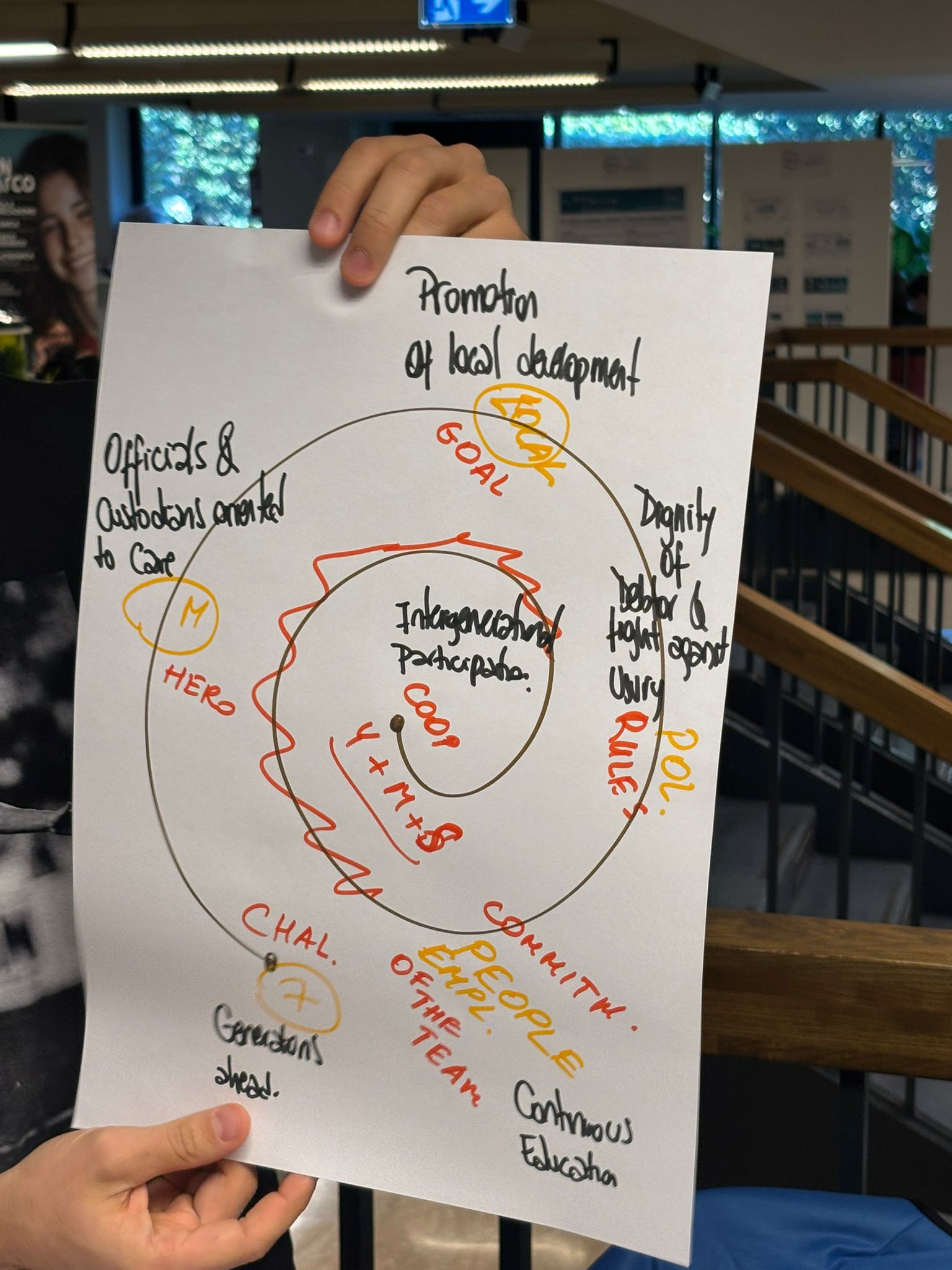 Intergenerational participation appeared as a core value in multiple groups. One group placed it at the center of their conceptual framework, represented visually as a spiral. Unlike linear models, the spiral reflects continuous movement, learning, and renewal. Each cycle revisits the same values with deeper understanding, reinforcing care, dignity, and cooperation over time. The experience and wisdom of senior generations enrich new ideas and technologies, while younger generations bring innovation and fresh perspectives. This dialogue between past and future enables institutions to evolve while remaining grounded in enduring principles.